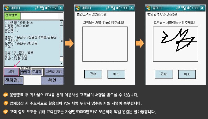 °áÁ¦ ´ã´çºÐÀÇ ÀÌ¿ë È®ÀÎÀ» À§ÇØ ¿îÇàÈÄ ±â»ç PDA¿¡ °í°´´ÔÀÇ ÀÚÇʼ¸íÀÌ ÀúÀåµÇ´Â ½Ã½ºÅÛ